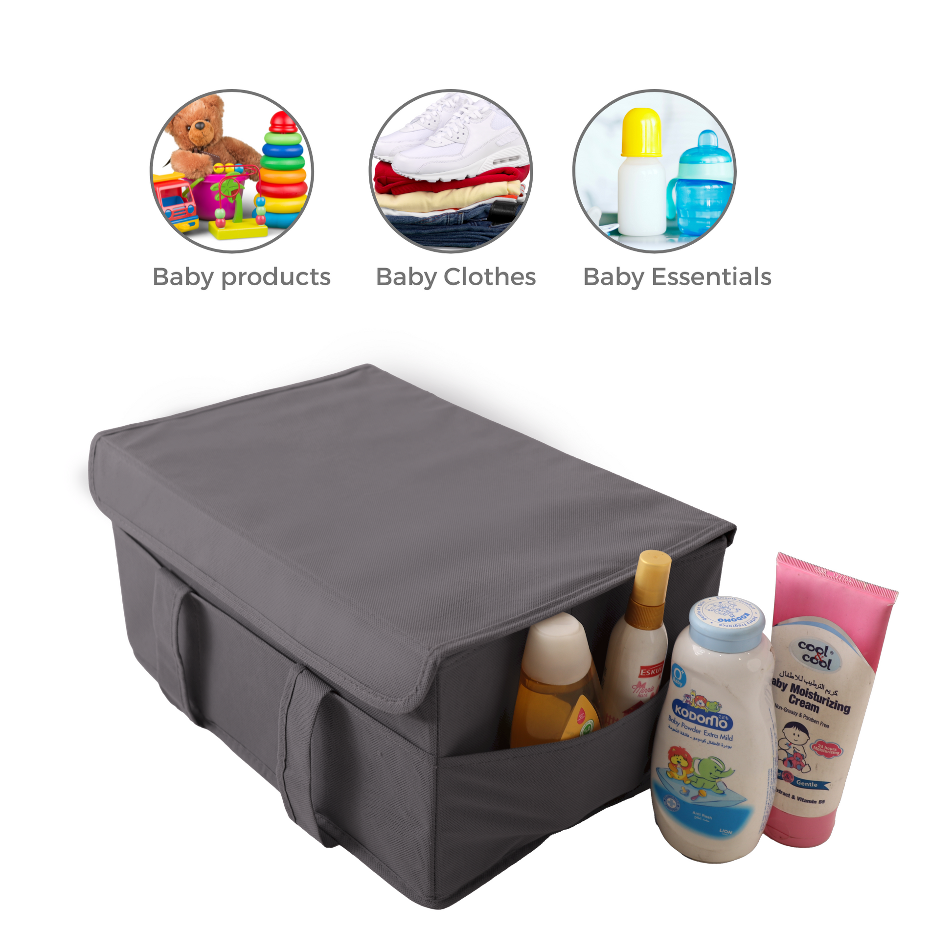 How to Use: Organize your baby essentials into the various compartments and pockets. The protective lid keeps contents dust-free, and the soft loop handles make it easy to carry around the house or on the go.